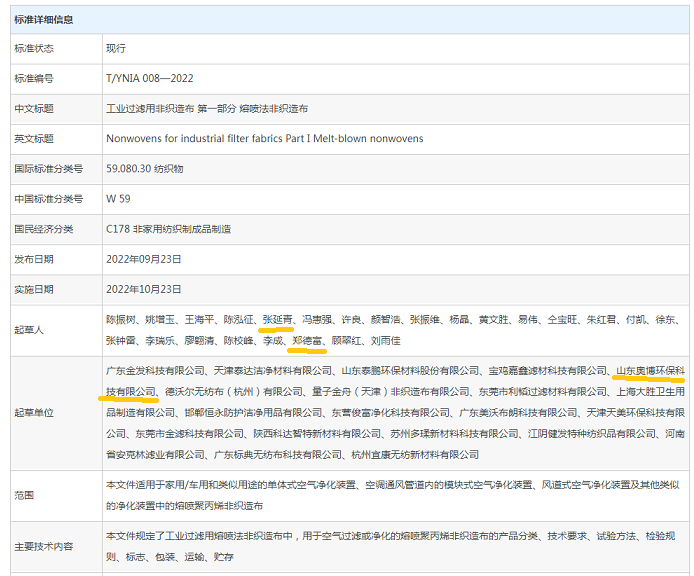 2022年9月23日,山東奧博環(huán)??萍加邢薰緟⑴c編制的 T/TNIA 008-2022《工業(yè)過(guò)濾用非織造布 第一部分 熔噴法非織造布》由上海長(zhǎng)三角非織造材料工業(yè)協(xié)會(huì)權(quán)威發(fā)布,并于2022年10月23日起實(shí)施。