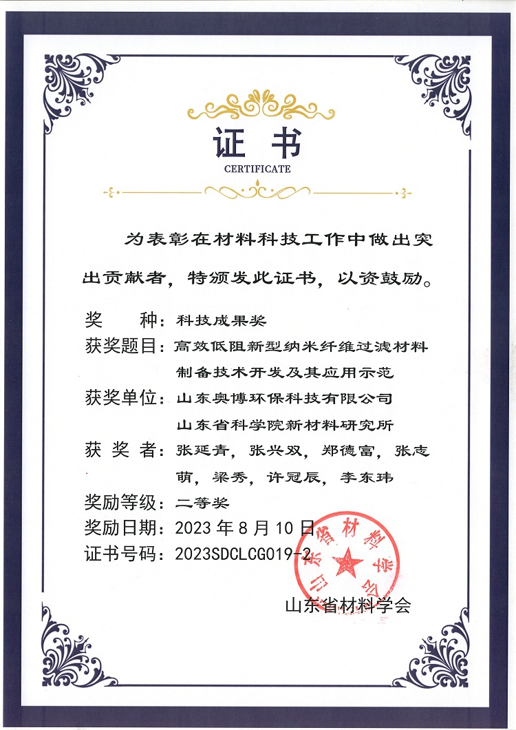 大會(huì)舉行的山東省材料科技成果頒獎(jiǎng)儀式,由山東奧博環(huán)保科技有限公司與山東省科學(xué)院新材料研究所,共同研發(fā)的“高效低阻新型納米纖維過(guò)濾材料制備技術(shù)開(kāi)發(fā)及其應(yīng)用示范”項(xiàng)目,以其優(yōu)秀的產(chǎn)品性能,廣泛的應(yīng)用領(lǐng)域及社會(huì)經(jīng)濟(jì)效益,榮獲二等獎(jiǎng)!