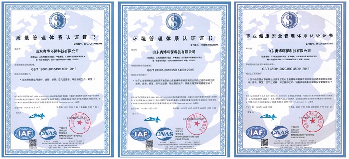 近日,山東奧博環(huán)保公司順利續(xù)證通過ISO三體系審核,喜獲ISO9001質(zhì)量管理體系、ISO14001環(huán)境管理體系及ISO45001職業(yè)健康安全管理體系認證證書。