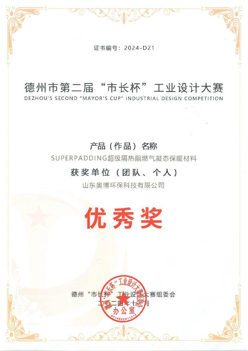 德州市第二屆“市長杯”工業(yè)設計大賽,旨在推動德州市工業(yè)設計創(chuàng)新發(fā)展,提升工業(yè)設計水平,賦能產(chǎn)業(yè)轉型升級。山東奧博環(huán)保申報作品《SUPERPADDING超級隔熱阻燃氣凝態(tài)保暖材料》,榮獲此次市長杯工業(yè)設計大賽優(yōu)秀獎!